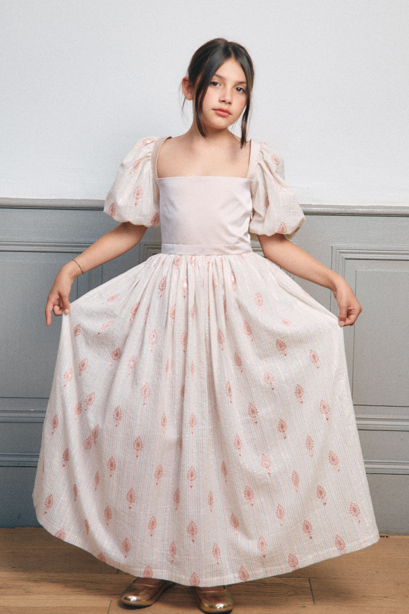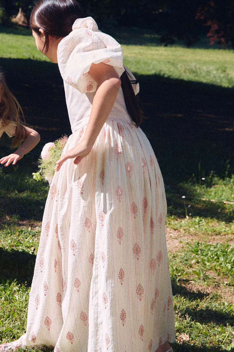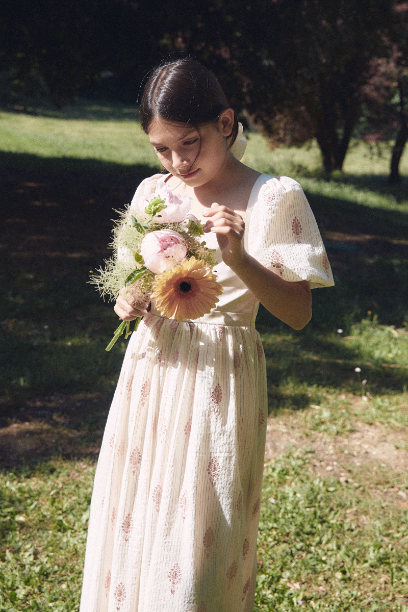 Robe longue pour fille en coton délicatement brodé de motifs losanges en sequins.Le bustier est en duchesse de soie rose pale. Les manches ballon apportent une touche aérienne et poétique à la silhouette.Élégante et légère, cette robe accompagne parfaitement les mariages et cérémonies d’été, offrant une allure à la fois raffinée et naturelle.La jupe est entièrement doublè en voile de  coton et tulle.