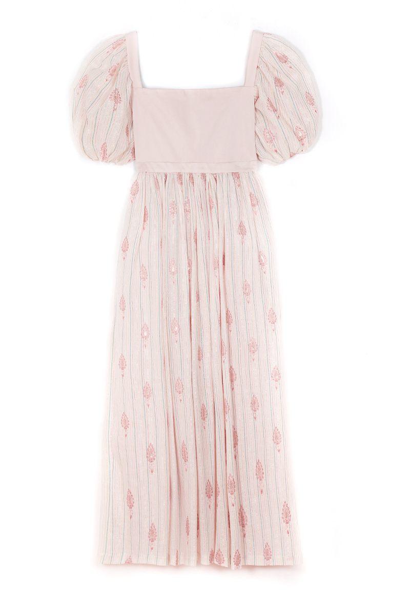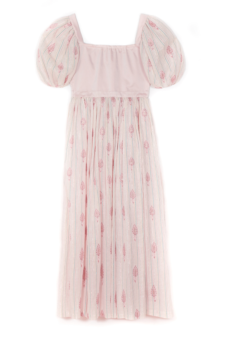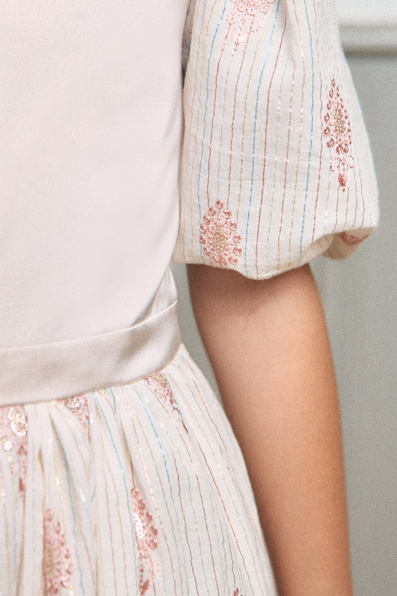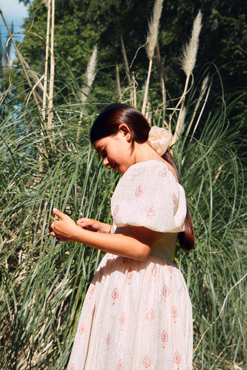 Robe longue pour fille en coton délicatement brodé de motifs losanges en sequins.Le bustier est en duchesse de soie rose pale. Les manches ballon apportent une touche aérienne et poétique à la silhouette.Élégante et légère, cette robe accompagne parfaitement les mariages et cérémonies d’été, offrant une allure à la fois raffinée et naturelle.La jupe est entièrement doublè en voile de  coton et tulle.