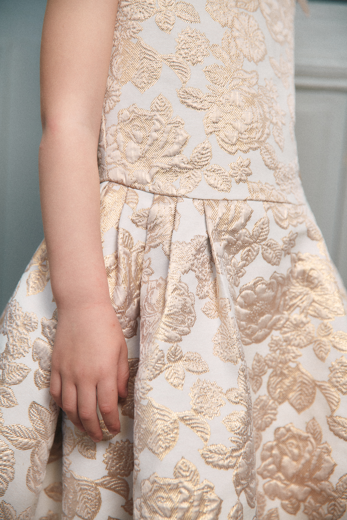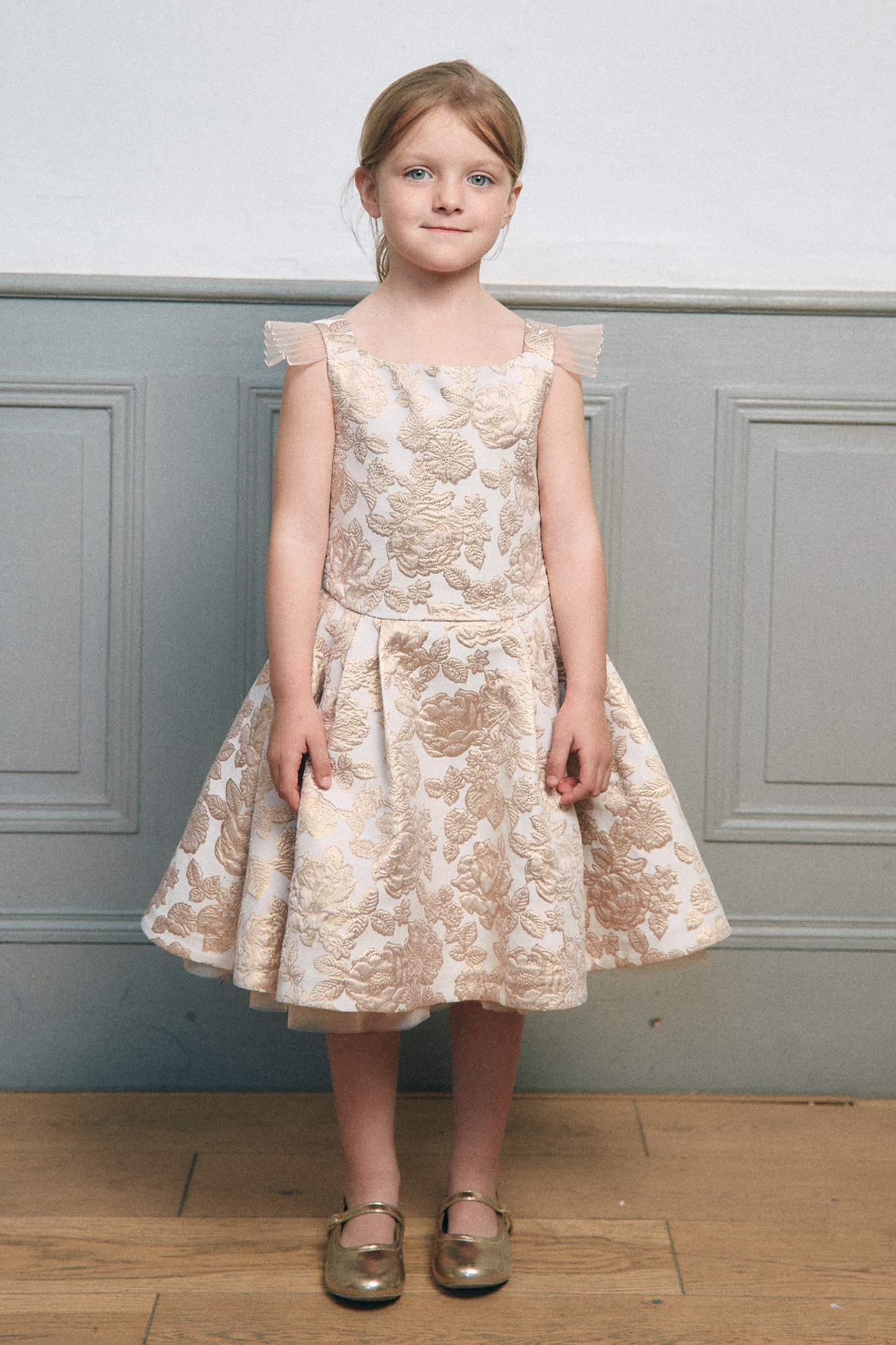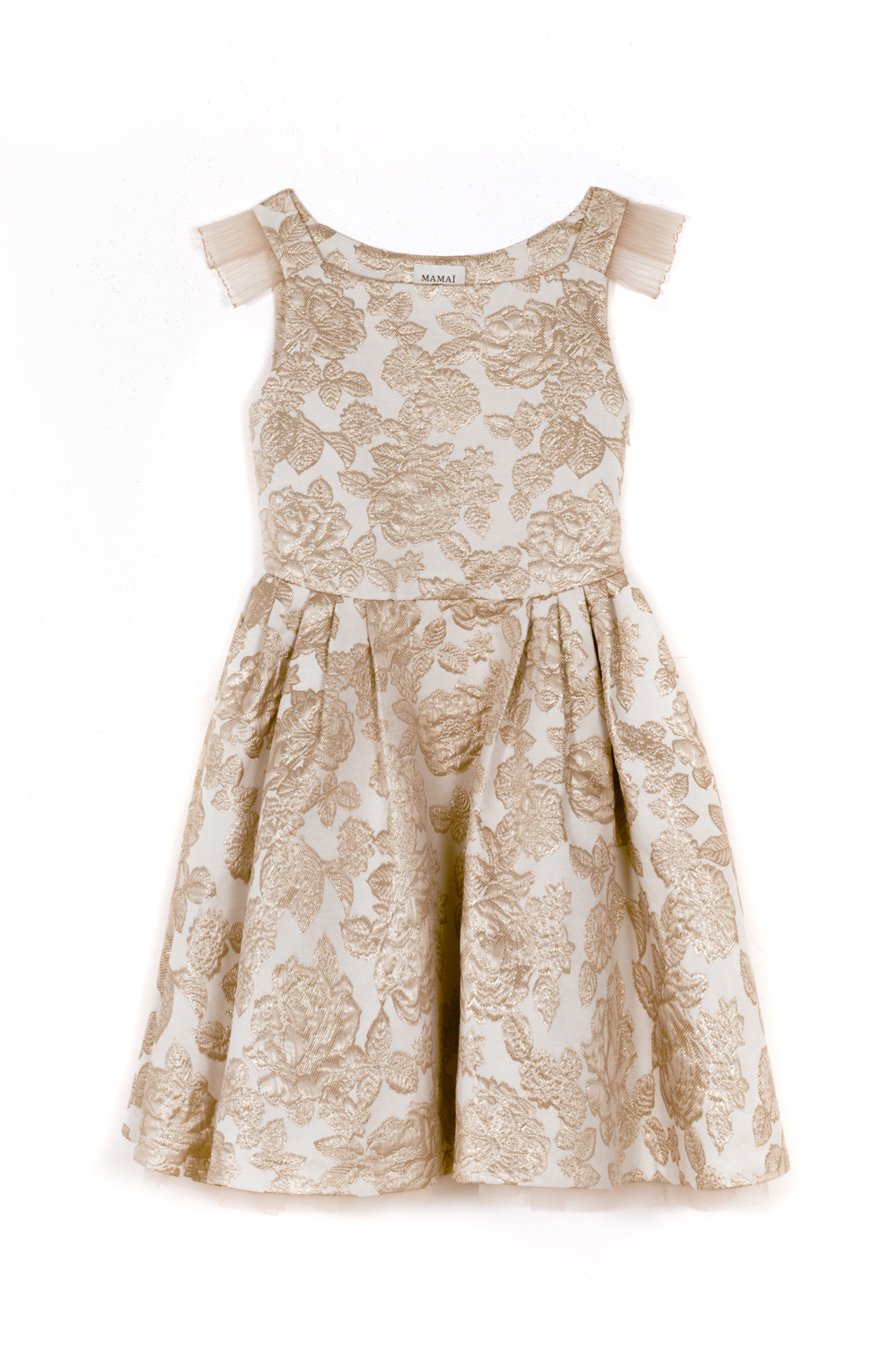 Robe de cérémonie délicate et lumineuse, pensée comme une pièce couture.Le bustier au décolleté droit est structuré par de fines bretelles ornées de volants plissés.La jupe à plis couchés crée un volume élégant et régulier, doublè en tulle et popeline de coton ,tenue et douceur sur la peau.Jacquard Tissè en France à motif de Roses couleur Dorè.