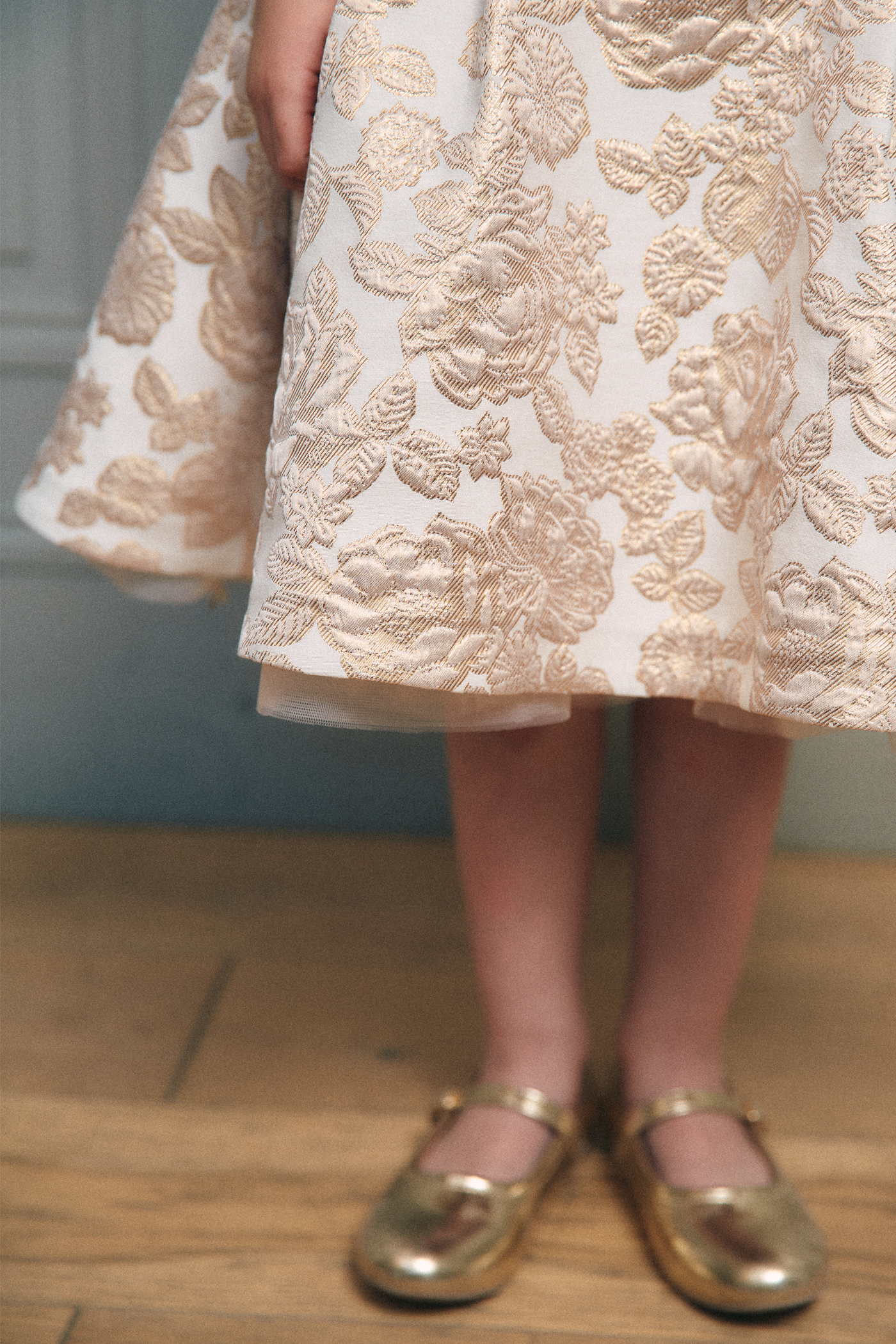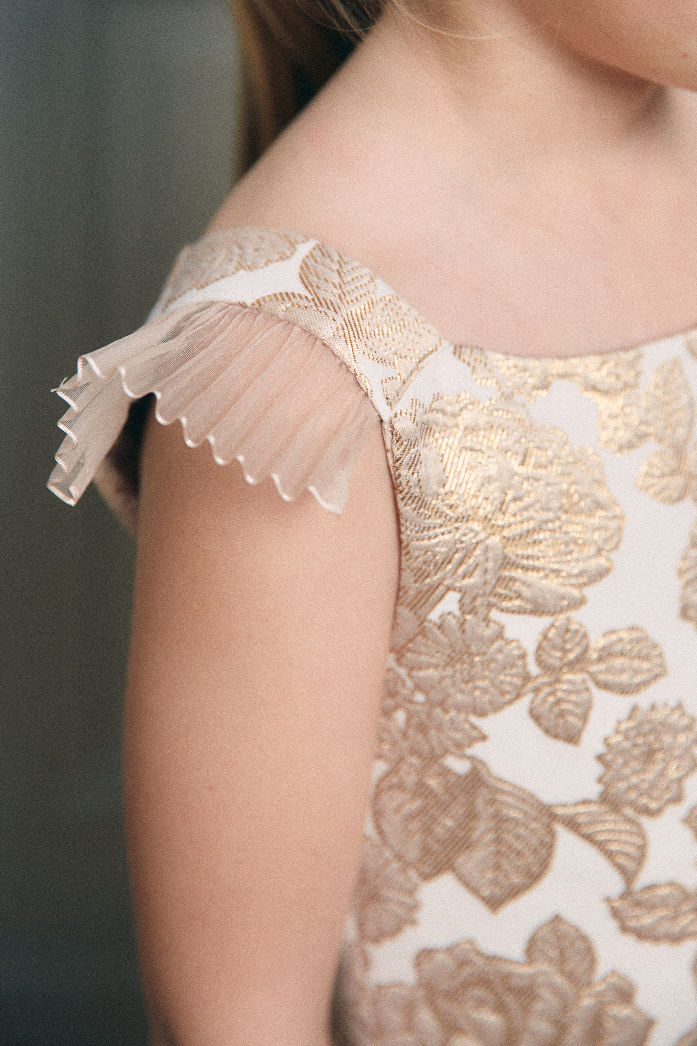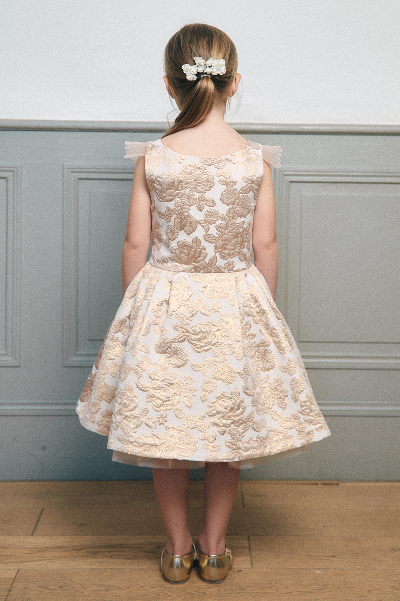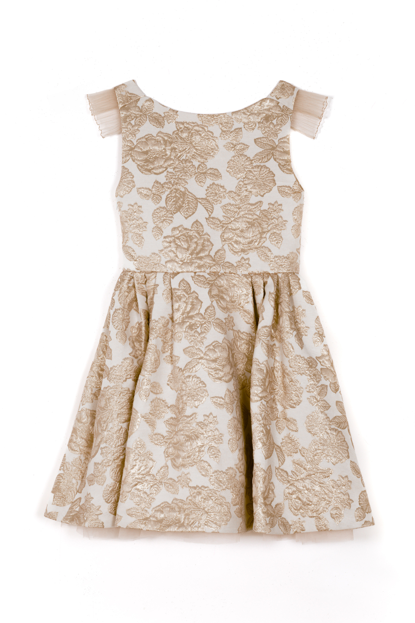 Robe de cérémonie délicate et lumineuse, pensée comme une pièce couture.Le bustier au décolleté droit est structuré par de fines bretelles ornées de volants plissés.La jupe à plis couchés crée un volume élégant et régulier, doublè en tulle et popeline de coton ,tenue et douceur sur la peau.Jacquard Tissè en France à motif de Roses couleur Dorè.