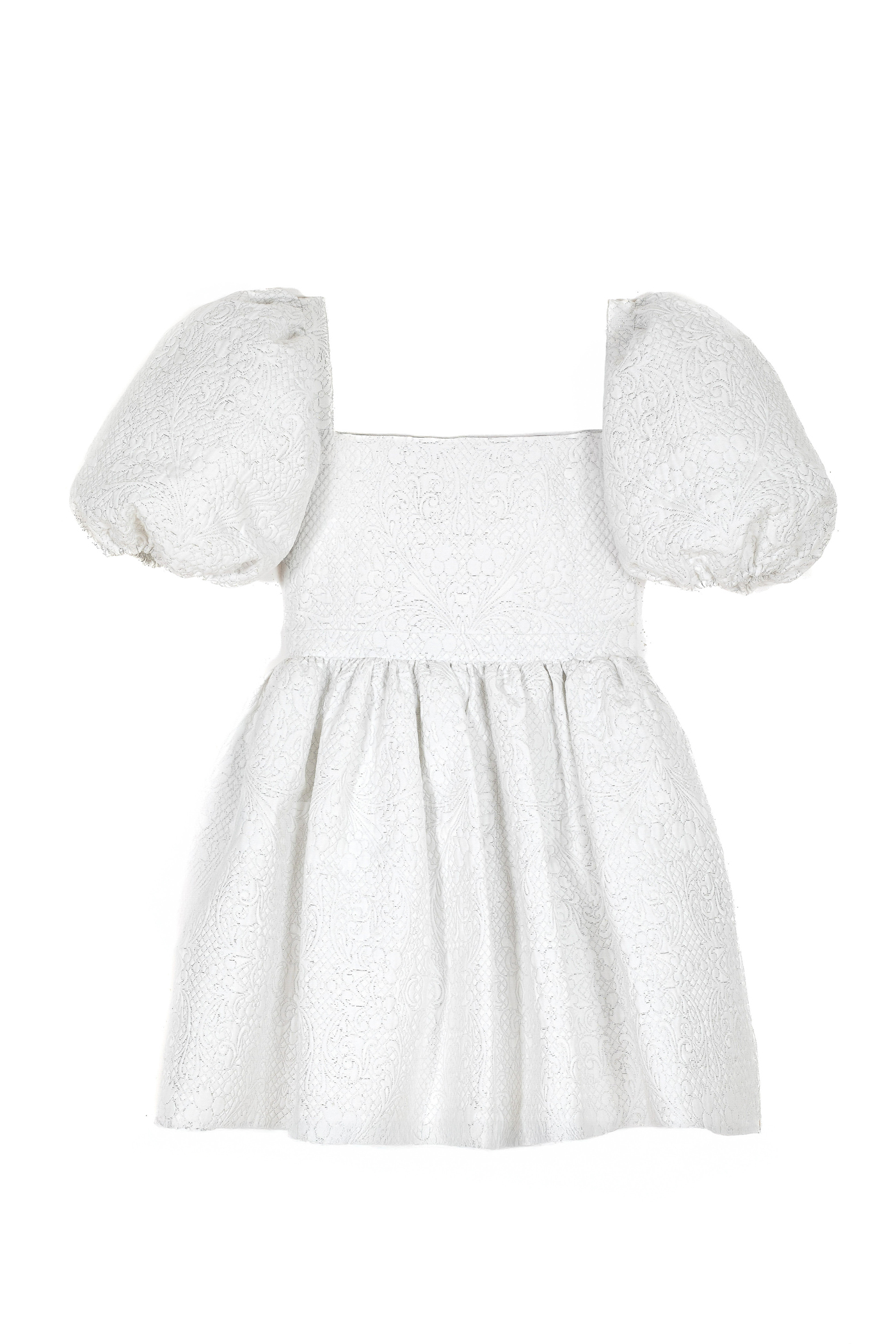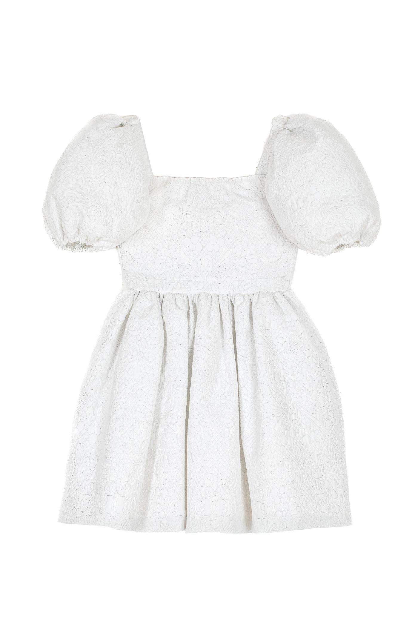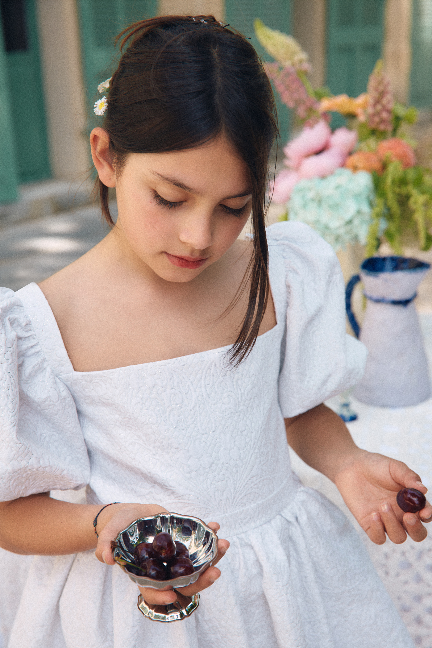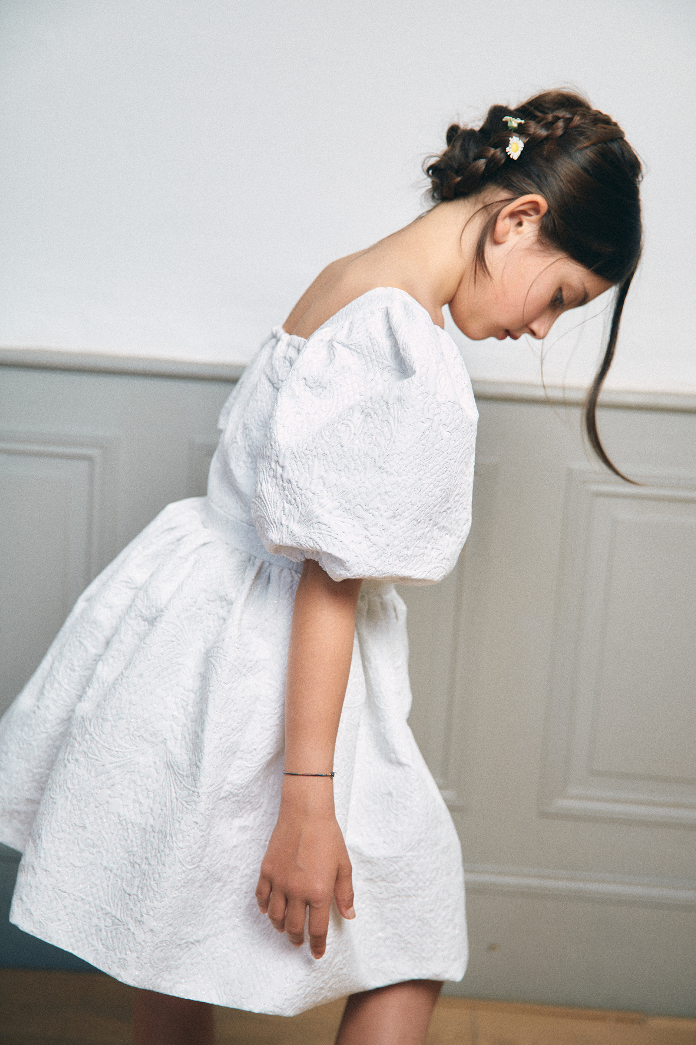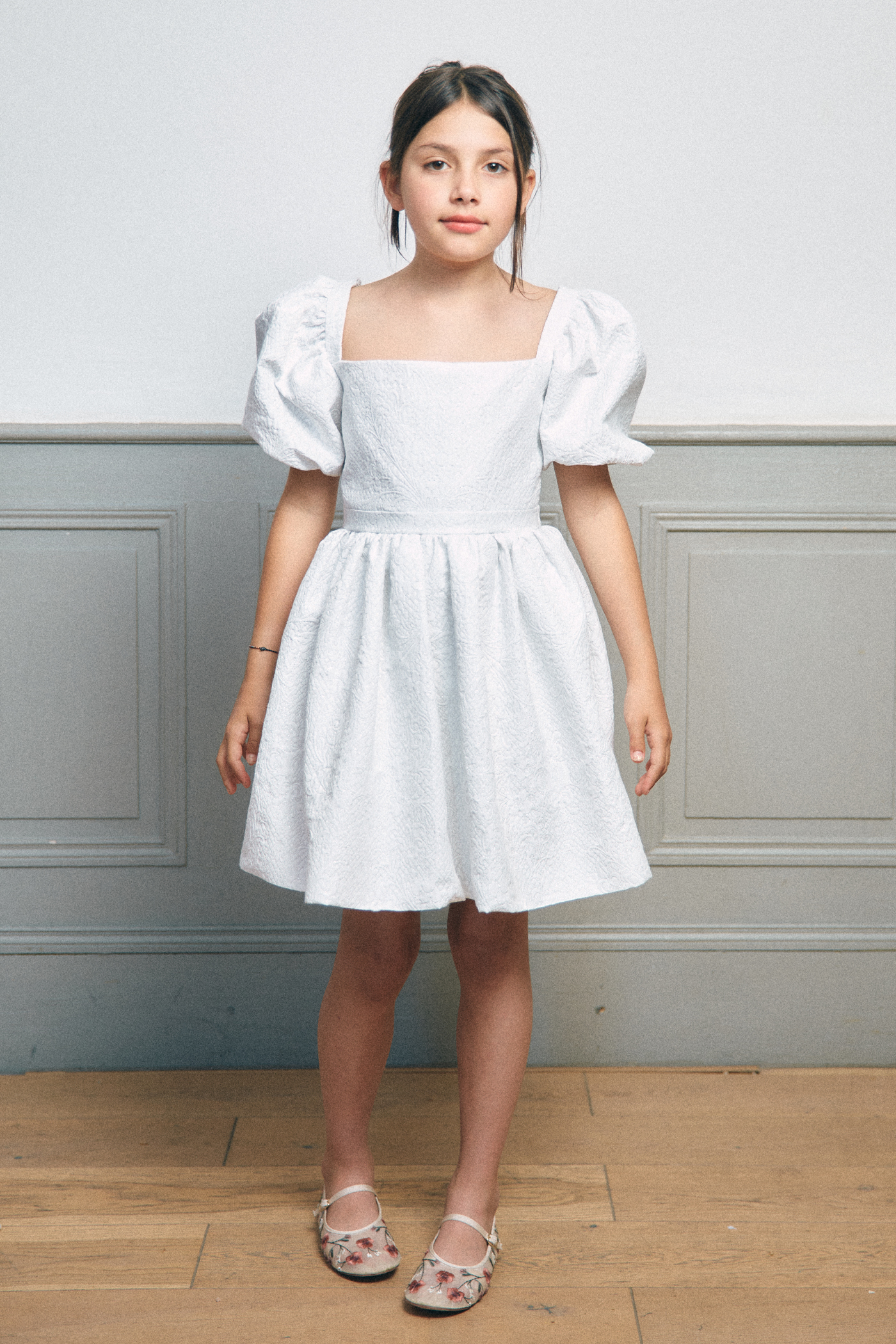 Robe au bustier structuré, accompagné de manches ballon et d’une jupe ample qui apporte volume et légèreté.Confectionnée dans un jacquard au motif inspiré du boutis provençal soulignè de fils lurex argent.La robe est doublée en tulle et coton pour un confort optimal.Ouverture zip de cotè.