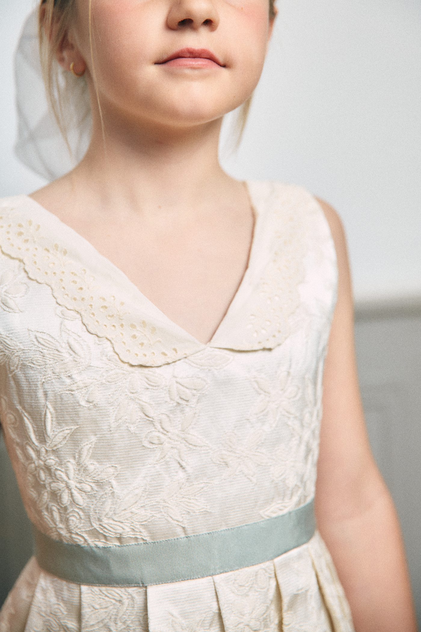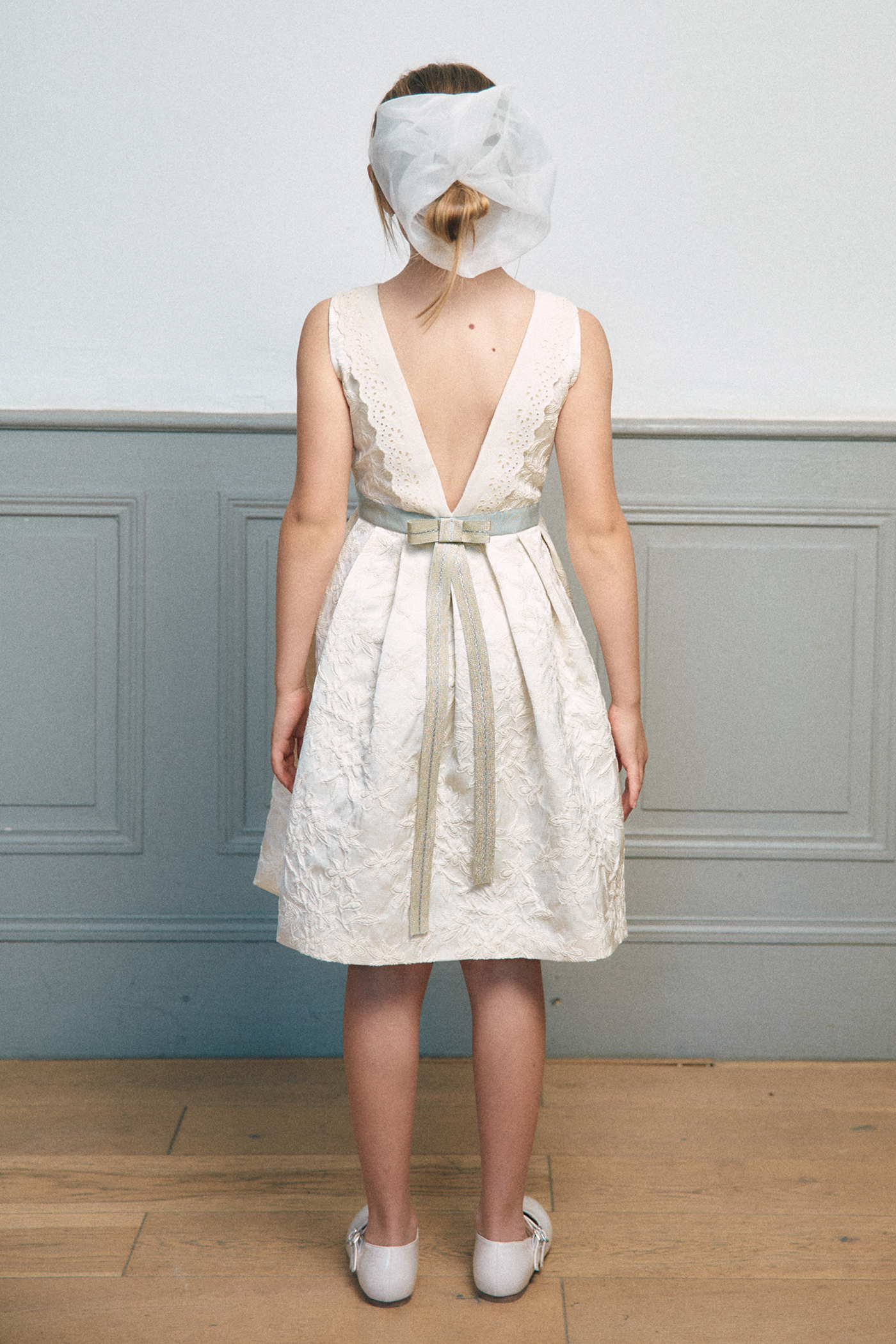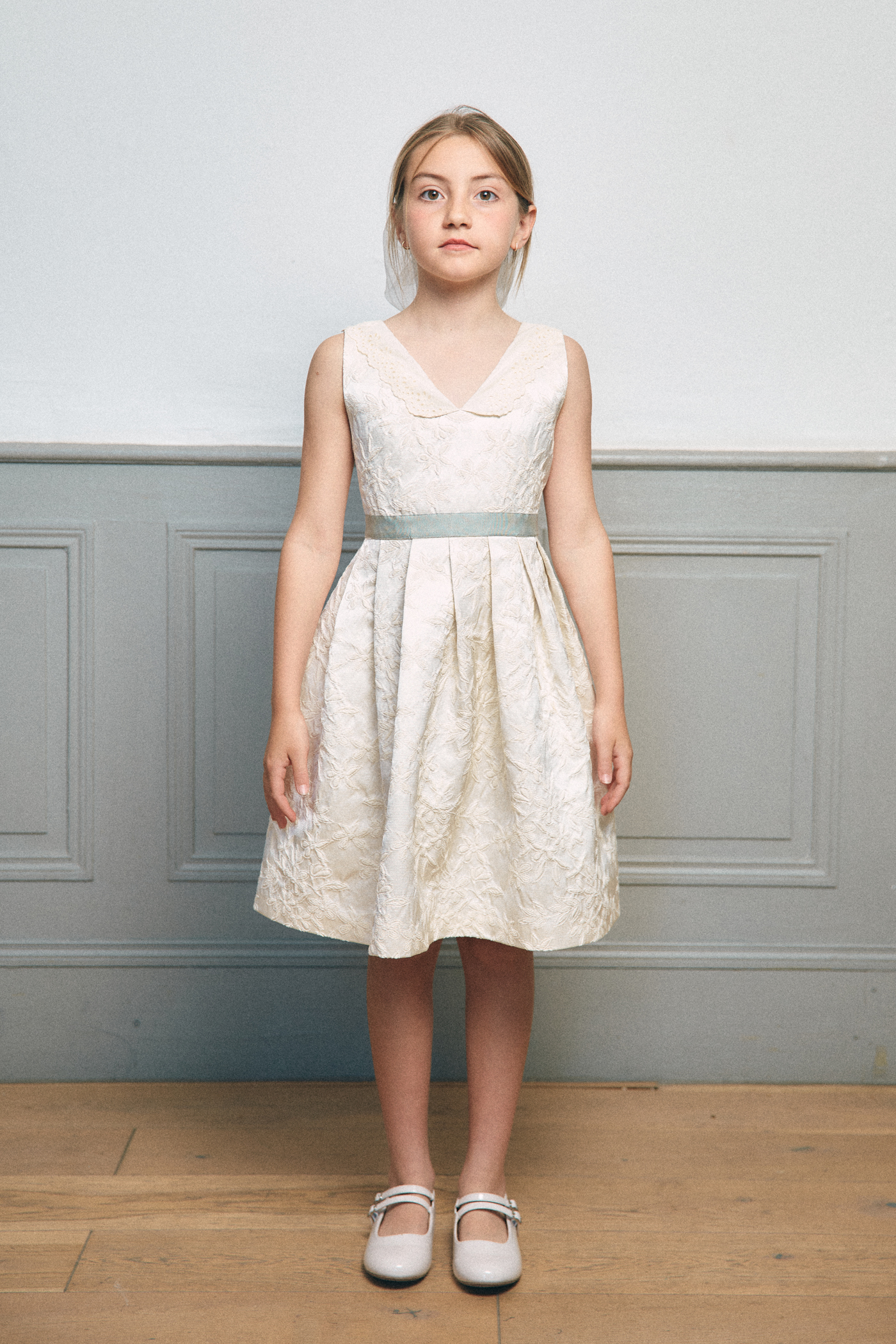 La robe fille Delia est une robe de cérémonie sans manches en jacquard ivoire, délicatement tissé d’un motif floral ton sur ton.Son col en coton brodé apporte une touche de raffinement, tandis que le décolleté profond dans le dos révèle une silhouette élégante et légère. La jupe est plissée.La taille est marquée par un ruban gros-grain qui se noue en un délicat nœud dans le dos.Le bustier est entoilé pour garantir un maintien parfait, tandis que la jupe entièrement doublée assure confort et tenue.