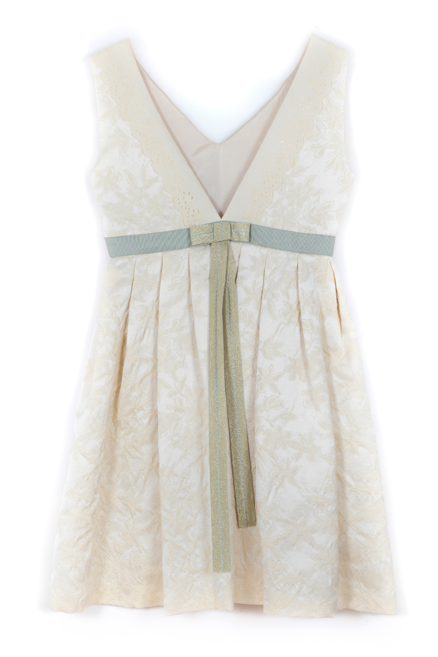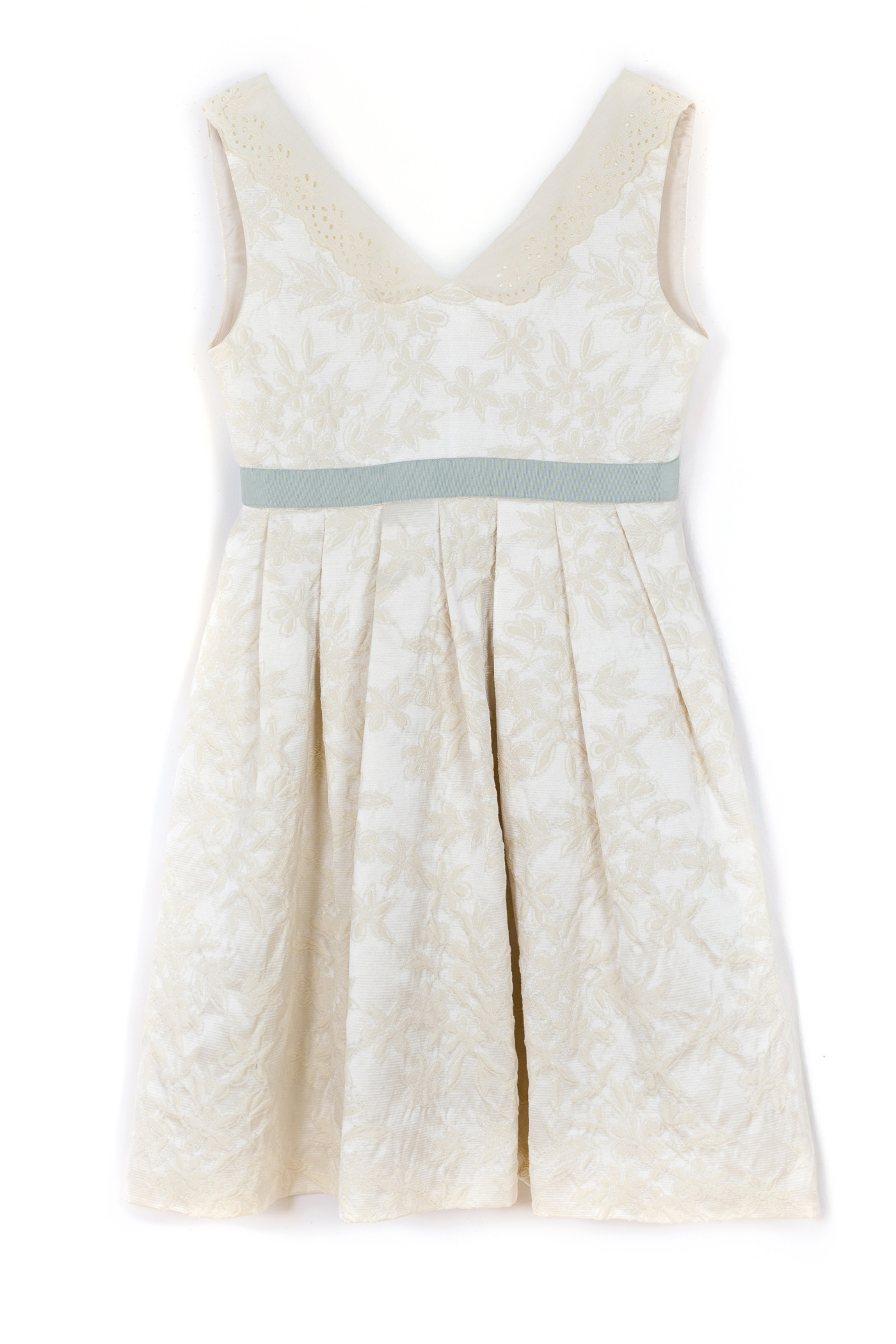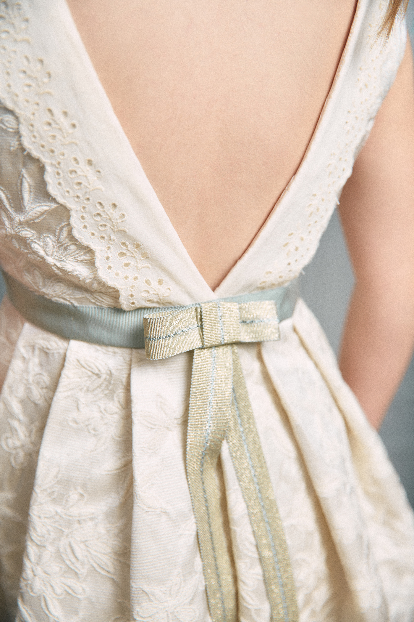 La robe fille Delia est une robe de cérémonie sans manches en jacquard ivoire, délicatement tissé d’un motif floral ton sur ton.Son col en coton brodé apporte une touche de raffinement, tandis que le décolleté profond dans le dos révèle une silhouette élégante et légère. La jupe est plissée.La taille est marquée par un ruban gros-grain qui se noue en un délicat nœud dans le dos.Le bustier est entoilé pour garantir un maintien parfait, tandis que la jupe entièrement doublée assure confort et tenue.