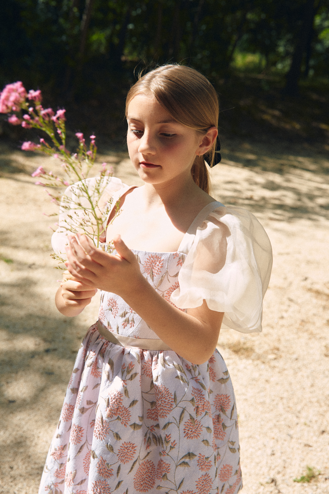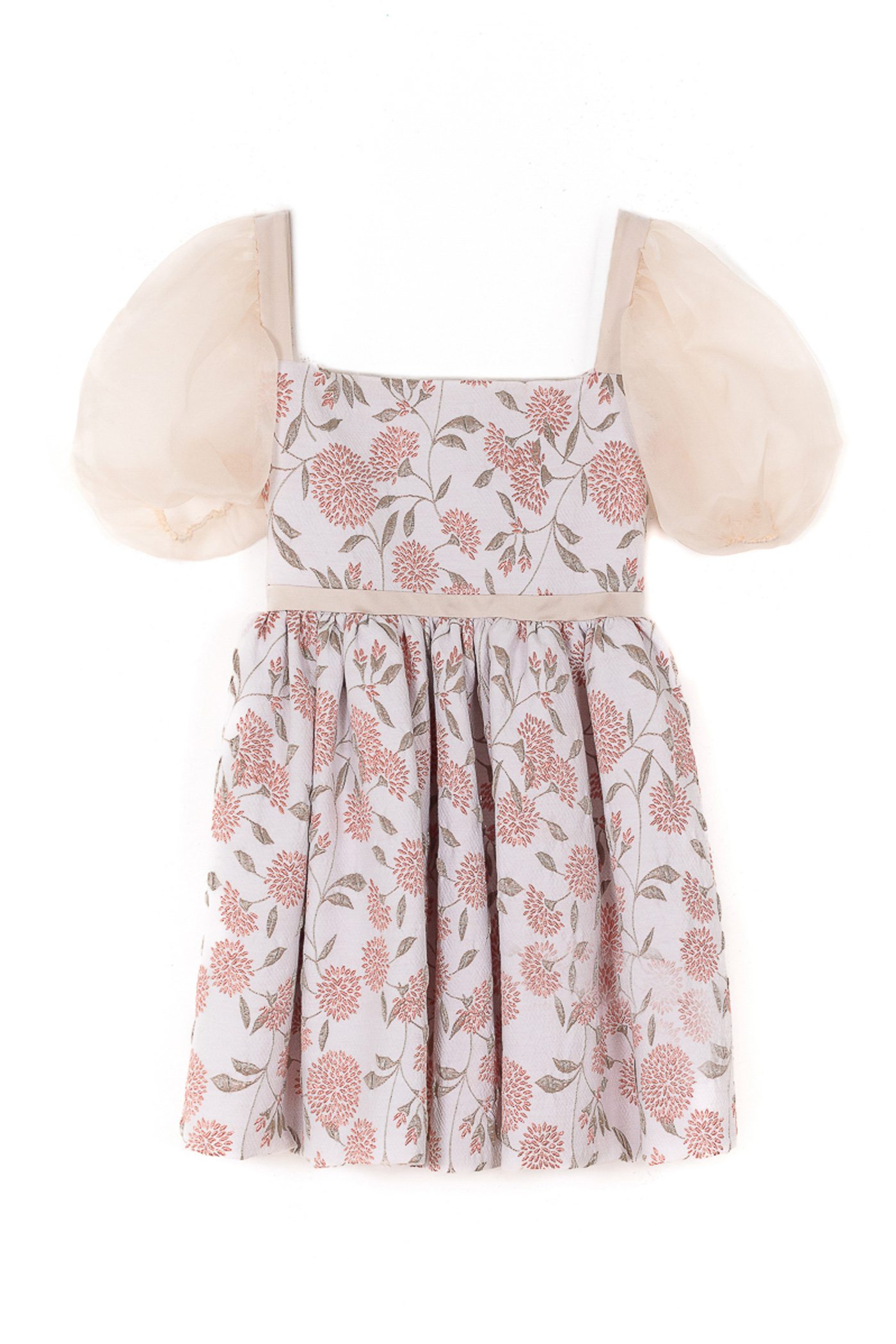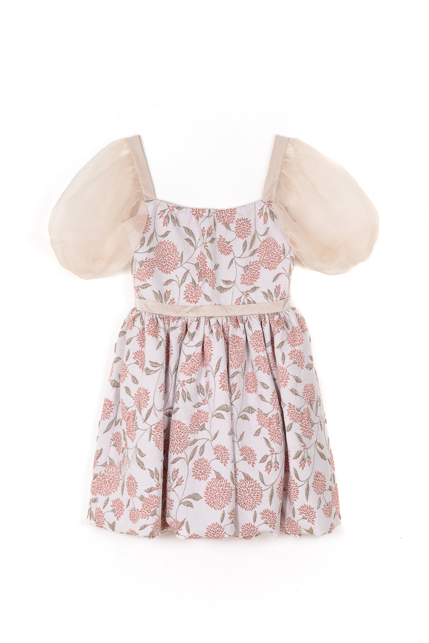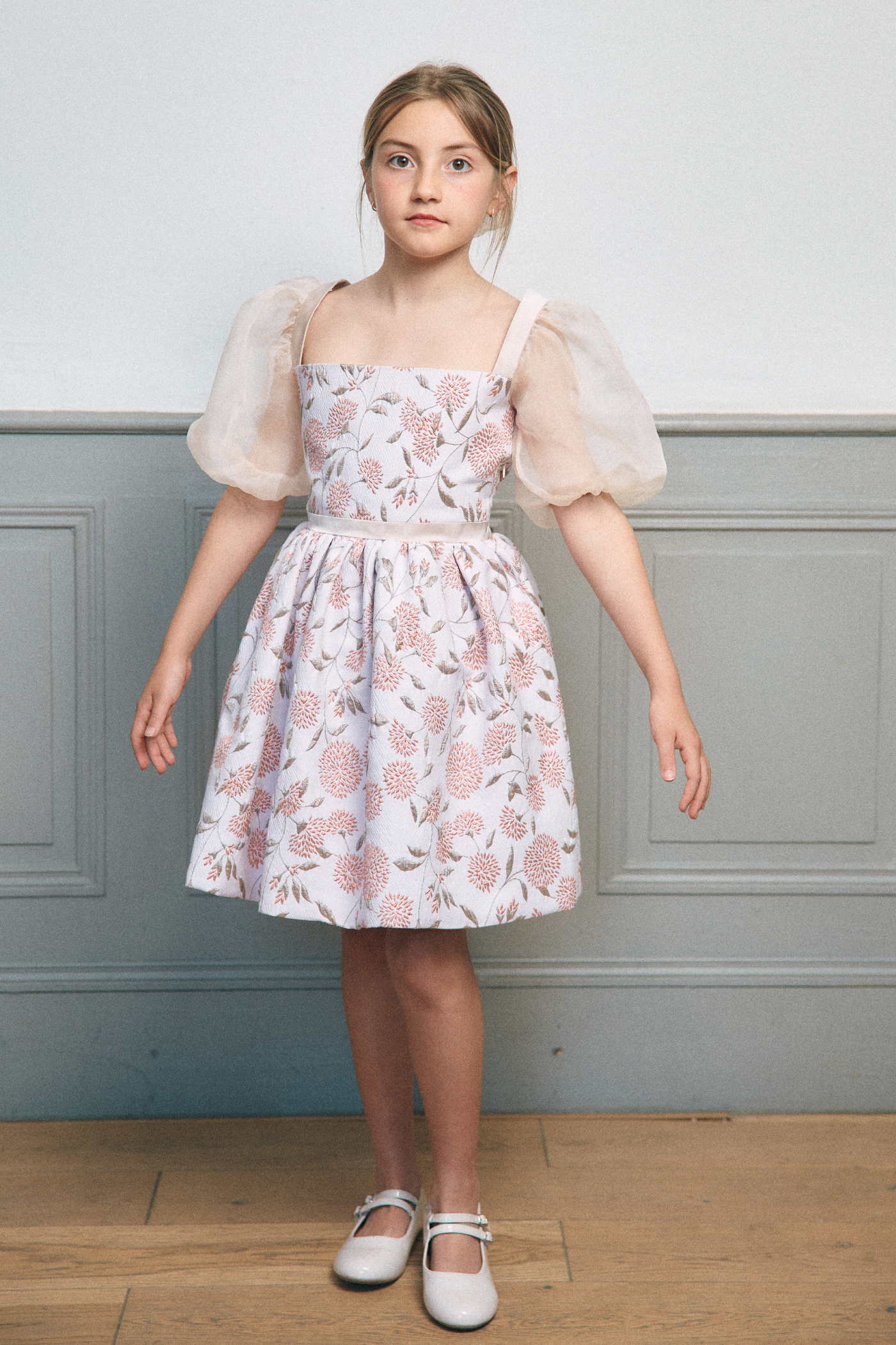 Robe fille à fleurs jacquard et manches ballon en organza de soie.Cette robe de cérémonie pour fille associe élégance et légèreté. Le bustier structuré en jacquard soutient la silhouette tandis que les manches ballon en organza de soie transparent apportent douceur et volume.La jupe ample doublée de tulle et de coton, assure confort et tenue tout en conservant une grande légèreté.Une création délicate, idéale pour les mariages, cérémonies et occasions spéciales.